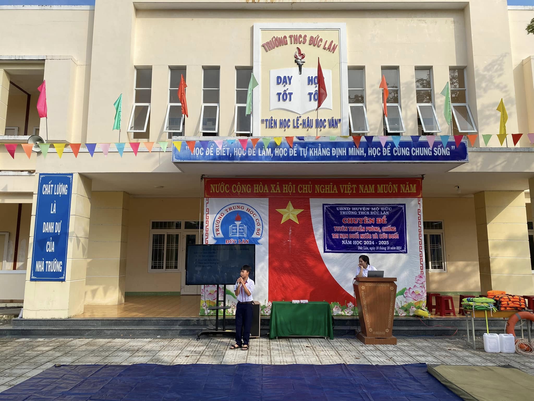 Mùa mưa lũ đến, nguy cơ xảy ra đuối nước, sạt lở và ngập úng tại nhiều khu vực trên địa bàn xã Đức Lân luôn tiềm ẩn, đặc biệt với lứa tuổi học sinh THCS còn thiếu kỹ năng tự bảo vệ bản thân. Nhận thức được điều đó, nhà trường đã đẩy mạnh công tác tuyên truyền và giáo dục kỹ năng phòng, tránh đuối nước qua nhiều hình thức phong phú: